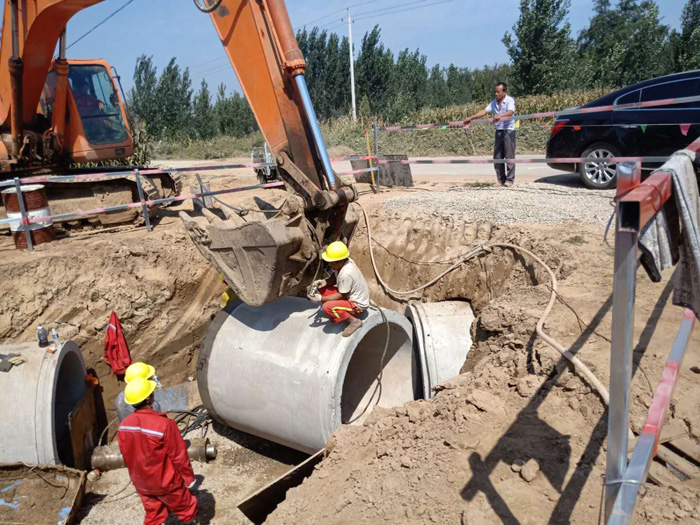 現場用挖掘機和鏟車對水泥管道進行運輸,然后再使用液壓頂管機在工作坑內進行頂進。